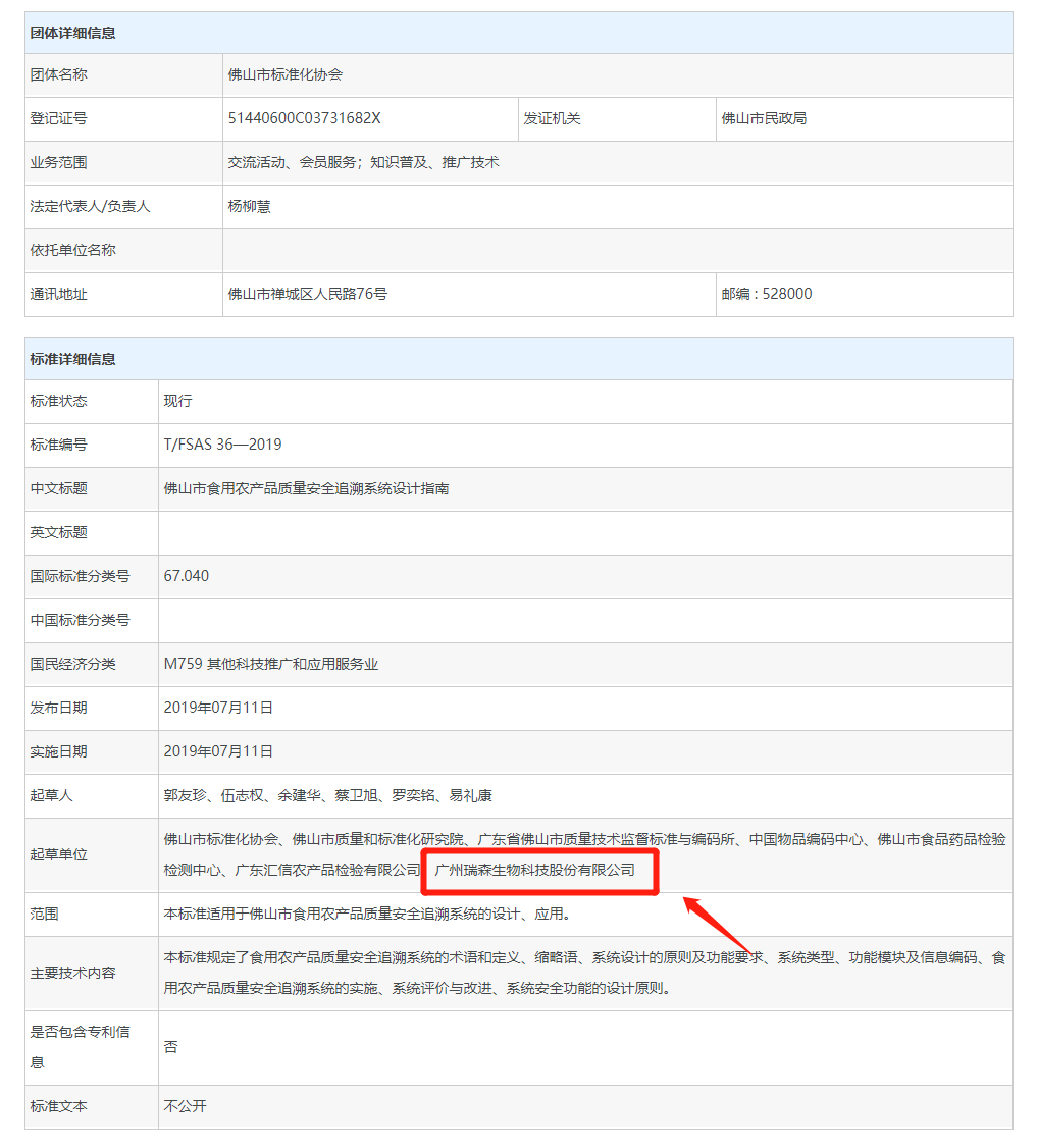 瑞森生物參與制定的T/FSAS 36—2019 《佛山市食用農(nóng)產(chǎn)品質(zhì)量安全追溯系統(tǒng)設(shè)計(jì)指南》團(tuán)體標(biāo)準(zhǔn)于2019年7月11日在全國(guó)團(tuán)體標(biāo)準(zhǔn)信息平臺(tái)發(fā)布公示。