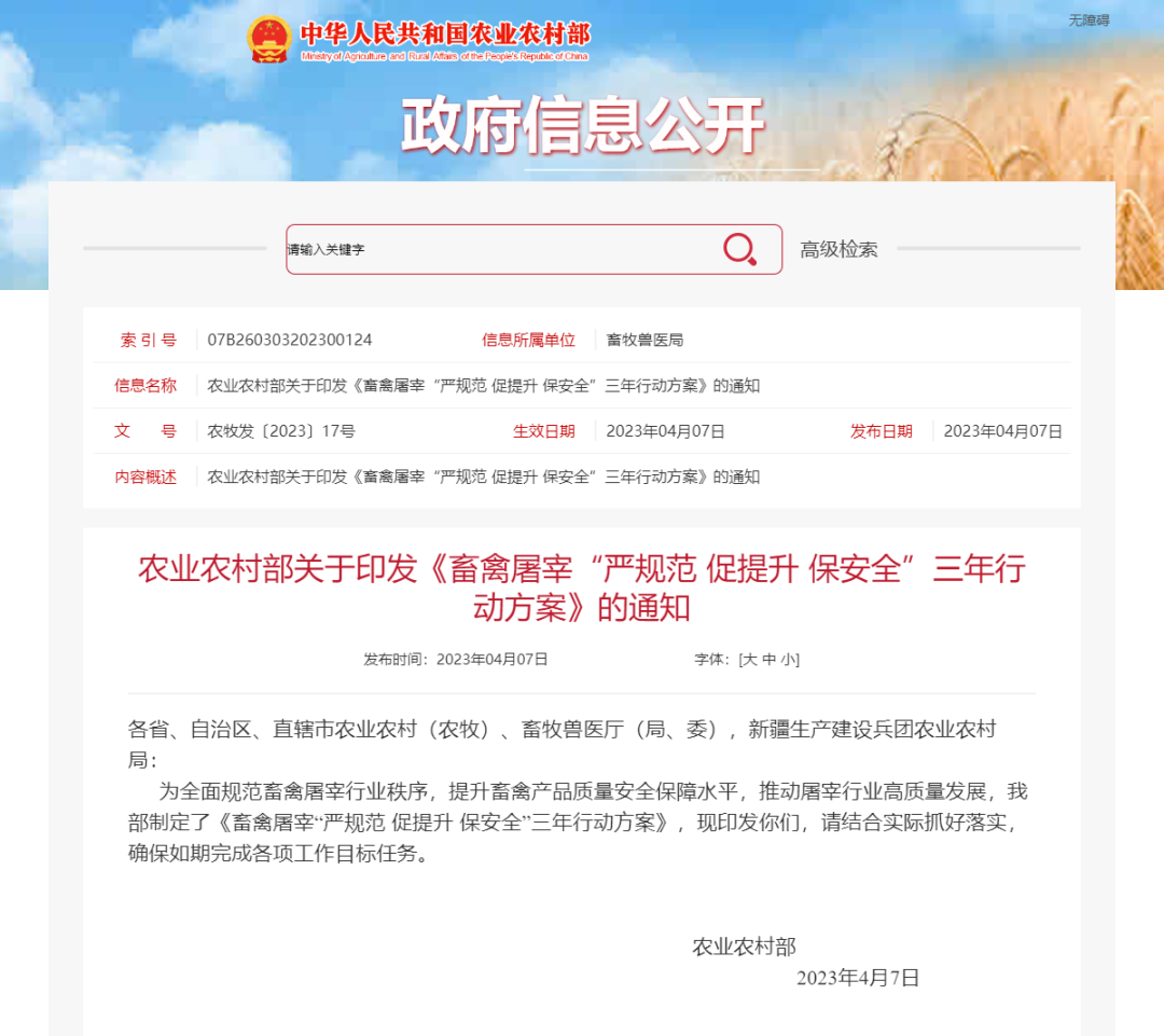 政策資訊 | 農業(yè)農村部關于印發(fā)《畜禽屠宰“嚴規(guī)范 促提升 保安全”三年行動方案》的通知