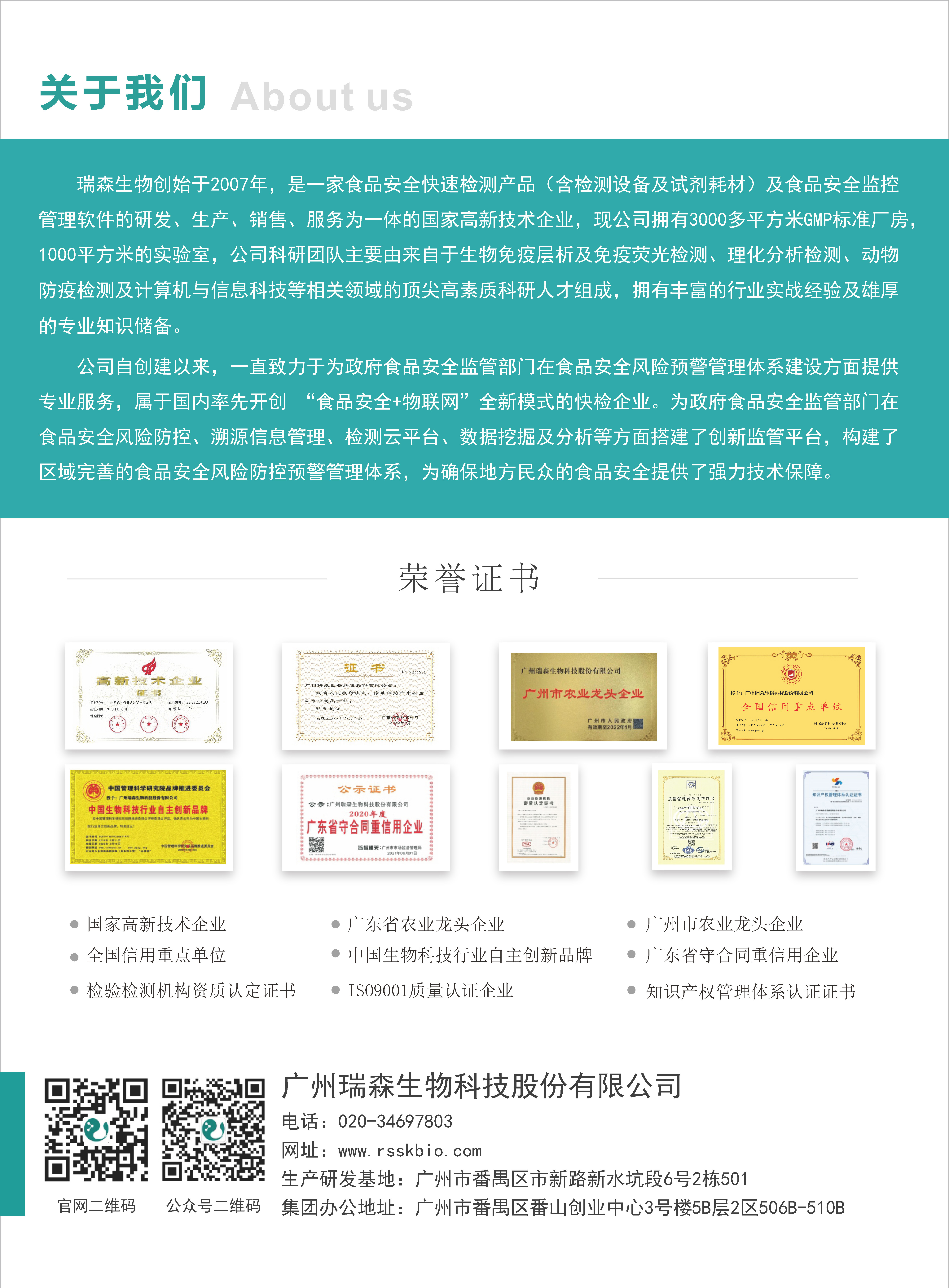 瑞森生物作為廣東省重點農業(yè)龍頭企業(yè),一直致力于食品安全檢測行業(yè),至今已深耕十六年之久。公司在食品安全檢測領域發(fā)揮了技術優(yōu)勢,憑借精湛的技術為客戶提供優(yōu)質、穩(wěn)定、可靠的產品,為國人食品安全保駕護航,也為推動食品檢測行業(yè)高質量發(fā)展貢獻了企業(yè)力量。公司屬國家高新技術企業(yè),廣東省重點農業(yè)龍頭企業(yè),廣州市農業(yè)龍頭企業(yè),全國重點信用單位,廣東省守合同重信用企業(yè),中國生物科技行業(yè)自主創(chuàng)新品牌企業(yè),目前擁有國家專利29項,國家軟件著作權18項,高新技術產品15項,技術項目研發(fā)5項。公司現(xiàn)擁有快速檢測試劑和設備上百種,核心產品通過農業(yè)農村部驗證,可為監(jiān)管部門、農牧企業(yè)、經銷商提供專業(yè)、全面的檢測產品和服務。